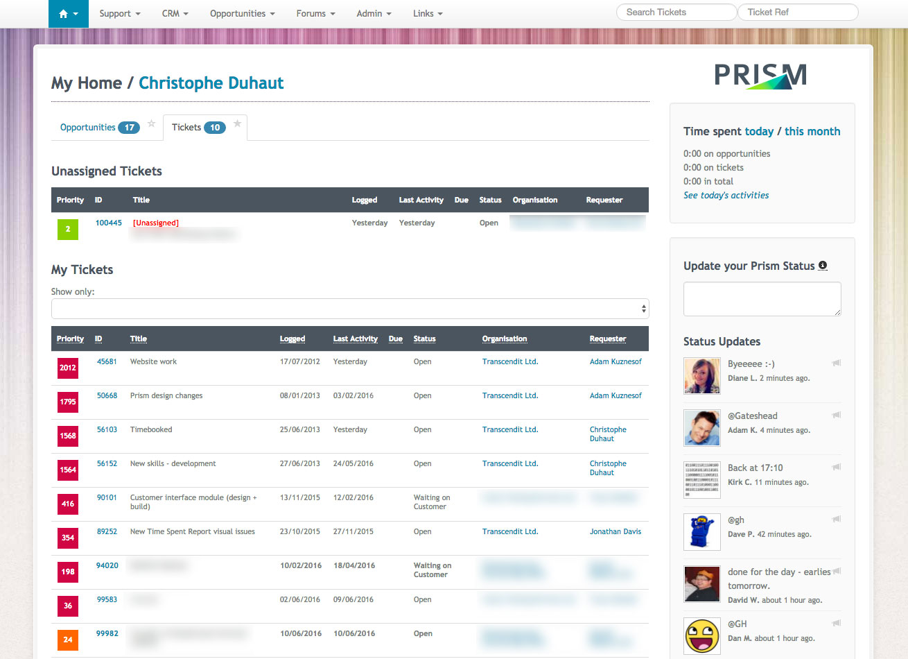 Our team use Prism to work on projects, as well as communicate with our clients. The application allows us to raise a ticket for the work we're doing, and record any progress made as an 'activity'.