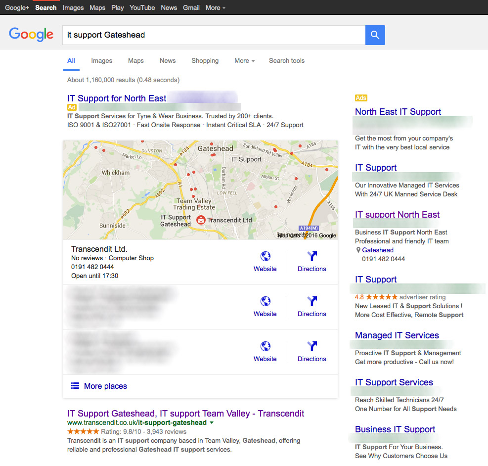 The screenshot above shows how Transcendit appears on Google when users search for IT Support Gateshead. You can see we are first after the paid for adverts (very top one and right hand side) and the business location map. We also appear near the very top for IT Support Newcastle or IT Support North East